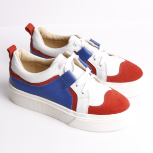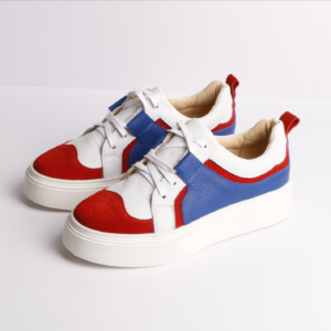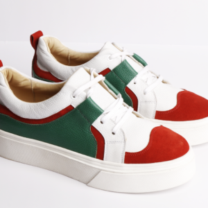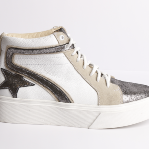 Elegante y cómoda, fabricada en cuero tono marfil satinado, renobuck en tono natural y aplicación de estrella en cuero dorado níquel. Planta de goma de altura 3,5 cms, forro en cuero badana natural. Cordones encerados en tono crudo y color caqui.